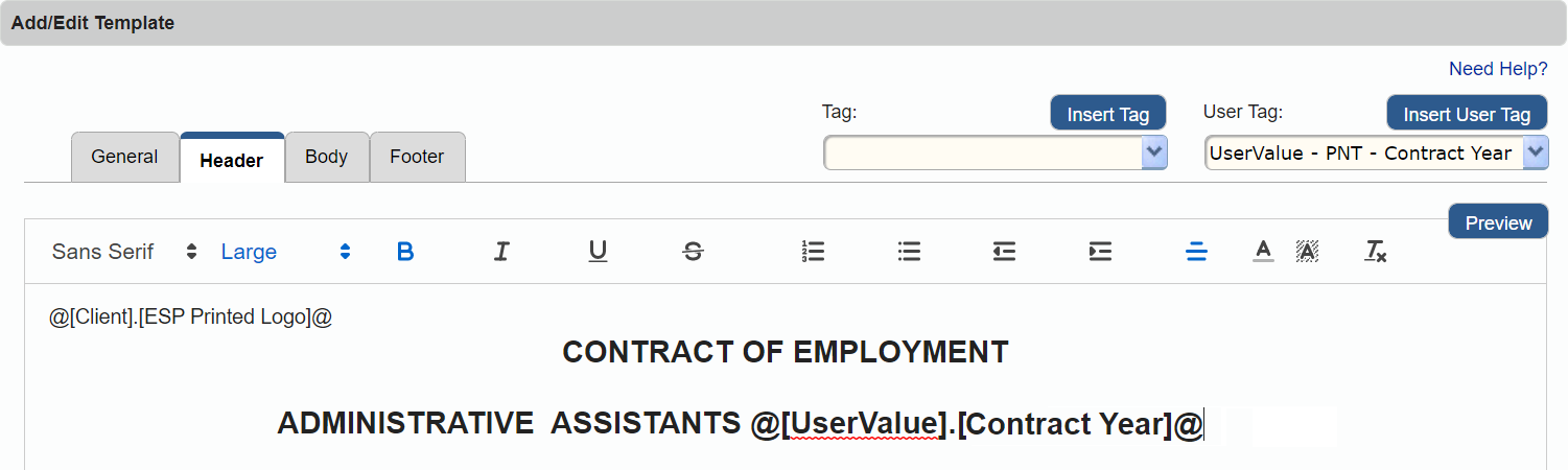 Best Practice: Use standard and custom tags to insert information into the template header that will change each year or is standard for your organization, e.g., organization logo, contract year, and so on. Type text manually only if that text will not change from one year to the next. Following this practice will save time when updating your contract templates for a new school year. Tags are inserted automatically after the last character typed on a page. This character might be in the template body, header, or footer. Best practice is to insert the tags as the contract header is typed. |