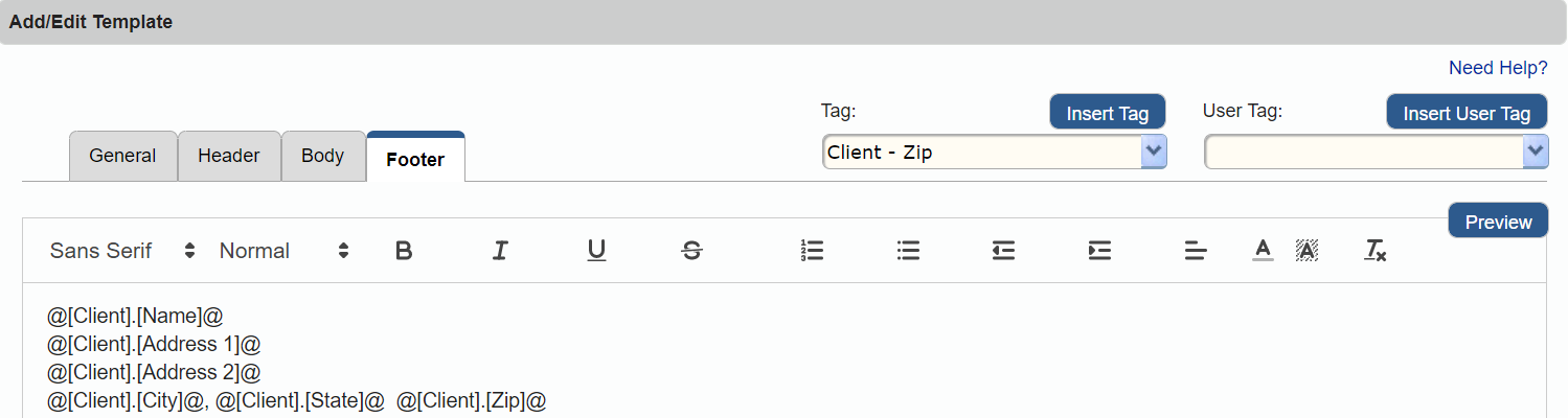 Follow these steps to modify the contract template footer. You can add, change, or remove a tag, update text, and apply different formats.